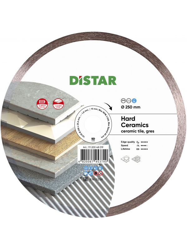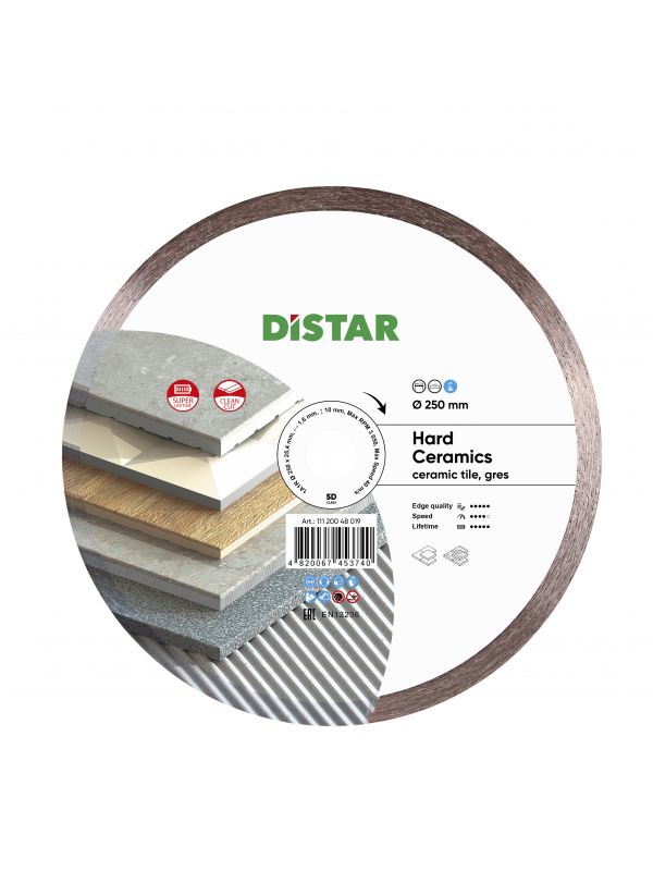 The DIAMOND BLADE 1A1R 10" HARD CERAMIK delivers high-performance cutting for ceramic tiles with or without decorative coatings, ceramic granite, and even harder materials like marble and granite. Its advanced design ensures exceptional precision and efficiency, making it the ideal choice for professional tile setters and masons.